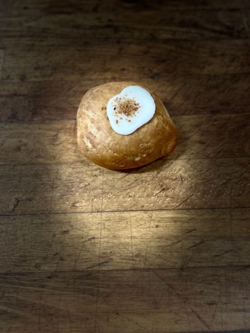 Flødefastelavnsbolle m\ sveskemarmelade, fløde.