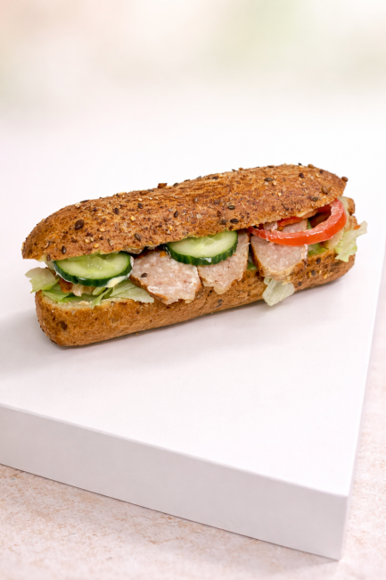 Fuldkornsbøf, salatmayo, salat, skinke, ost, tomat & agurk.