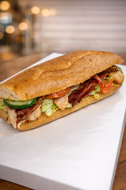 Grovbrød, salatmayo,salat, kylling, bacon, tomat & agurk.