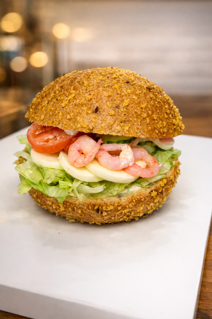 Majsbolle, æg, rejer, salatmayo, salat, tomat & agurk.