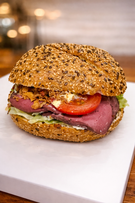 Surdejsbrød, salatmayo, salat, roastbeef, ristet løg, remoulade, tomat & agurk